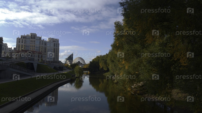 Вид на красивое отражение в городском канале с парком. Резервные кадры. Красивая река с зеленым парком в городской среде. Хорошо ухоженный парк с речным каналом в современном городе