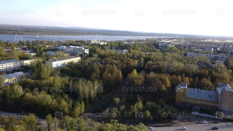 Вид на город на фоне реки и осеннего леса. Клип. Пейзаж города с деревьями в солнечный день осени. Город на реке в лесной зоне осенью