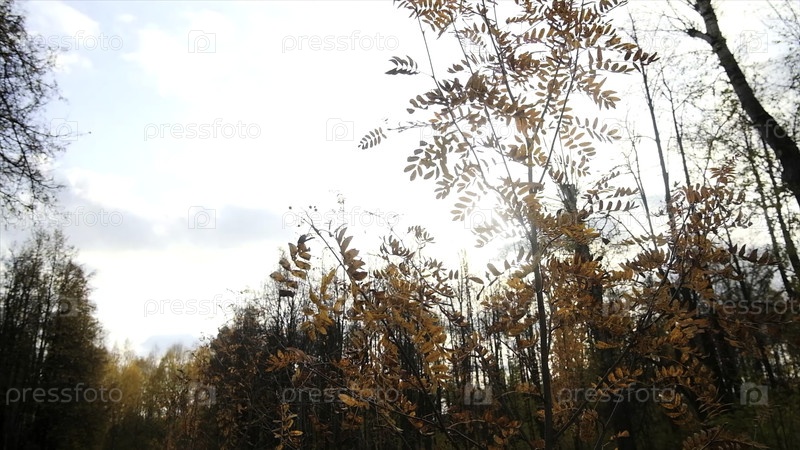 Красные листья деревьев на фоне солнечного света в осеннем лесу. Осенние листья горного пепла в лесу. Редкие листья деревьев против яркого неба осенью