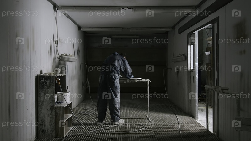Работник полирует доску перед покраской.Креативность.Рабочий в костюме измельчает доску в специальной комнате.Меление продукта перед покраской в гостиной