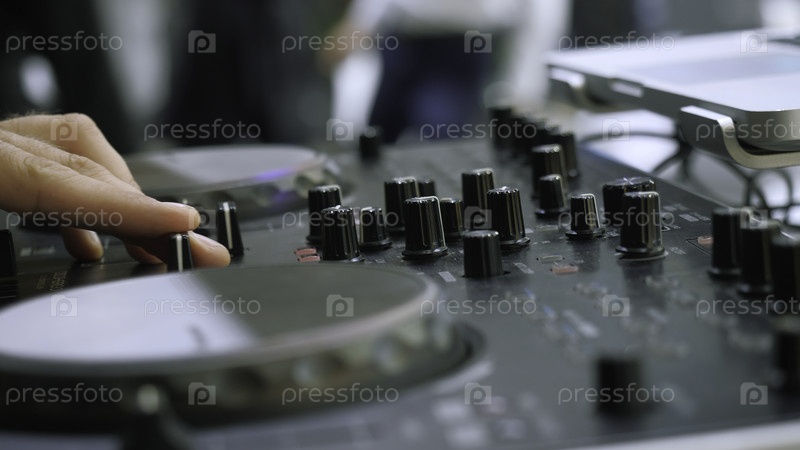 Люди играют на диджейских консолях. СМИ. Человек переключает кнопки на музыкальной консоли. DJ Plays New Music Console at Disco
