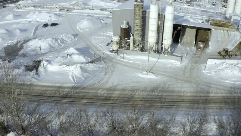 Зимний взгляд на природу с вертолета. Клип. Большие снежные заносы возле фабрик и вблизи дорог и автомобилей