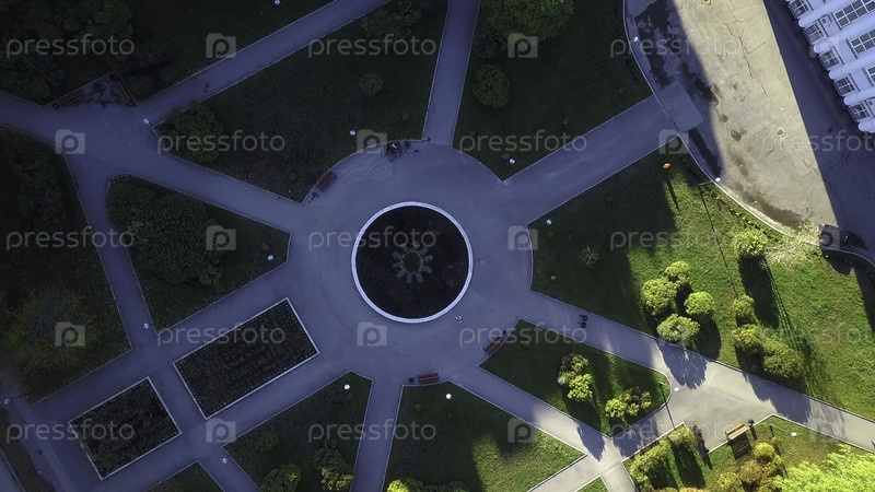 Вид на сад с фонтаном в поместье. Образец дорожек с фонтаном в центре древнего Чада. Старый ухоженный сад с фонтаном и особняком