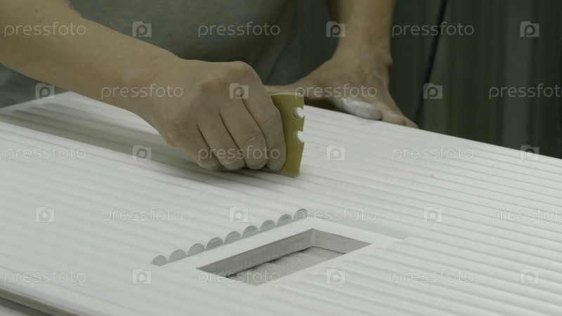 Закрытие шлифовального изделия плотника.Креативность.Человек своими руками полирует линии на деревянной доске.Песочная доска с линиями