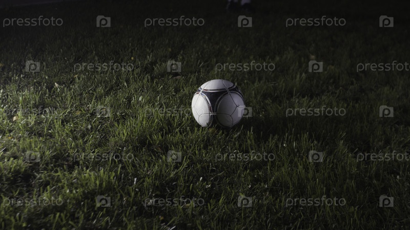 Замыкание футбольного мяча на траве. Резервные кадры. Один футбольный мяч лежит на зеленом газоне. Футбольный мяч лежит на лужайке с ночным освещением