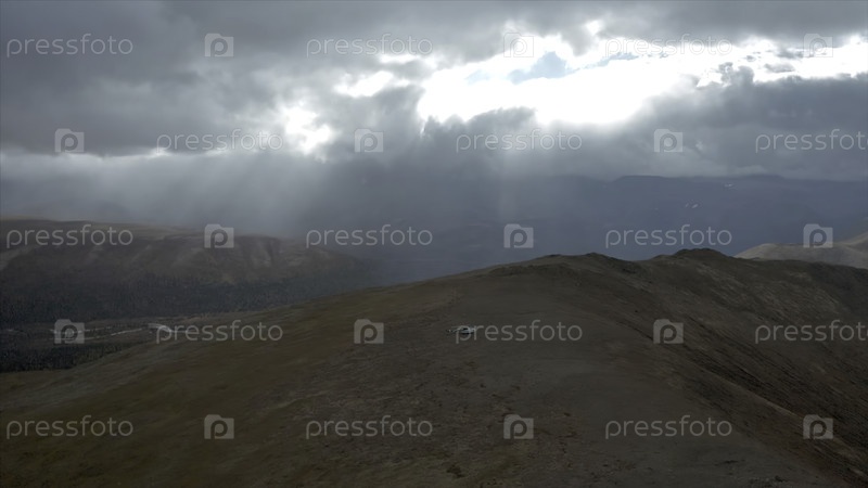 Вид сверху вертолета, стоящего на горе.Вертолет остановился на горе с видом на горизонт с облаками.Прекрасный пейзаж с горами и солнечным светом в облаках