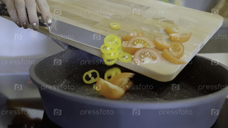Процесс приготовления пищи. продолжайте. рука женщины с красивым маникюром начинает жарять овощи с помидорами и перцем в нагретой сковородке с маслом. высококачественный 4k кадры