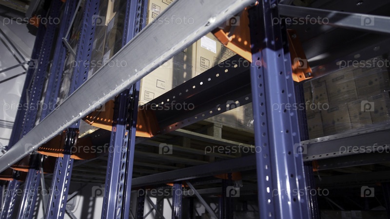 Стеллажи с коробками на складе.Креативное.Закрытие железных полок на складе.Железные полки со товарами на складе предприятия или магазина