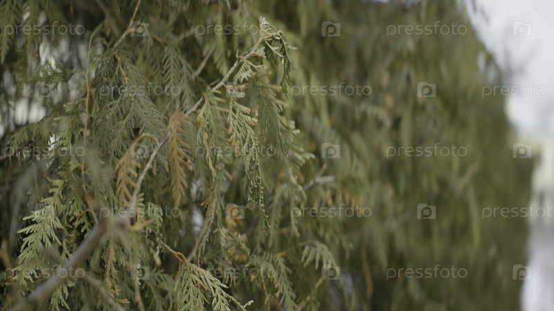 Закройте ветвь зеленого дерева, качающегося на ветре. идите вперед. природный ландшафт с кустарниками или деревьями, растущими рядом