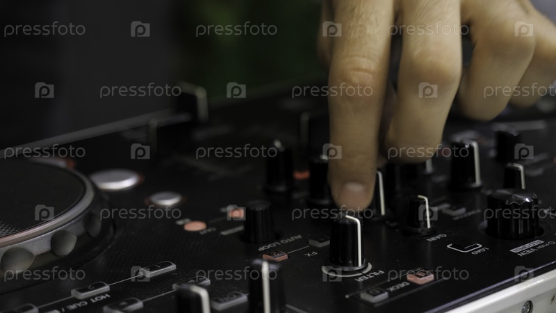 Люди играют на диджейских консолях. СМИ. Человек переключает кнопки на музыкальной консоли. DJ Plays New Music Console at Disco