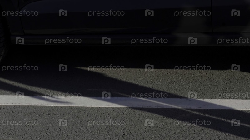 Солнечный асфальт. HDR. Голубая машина, в которую заходит мужчина с черными кожаными ботинками и темными джинсами. Высококачественная 4k-запись