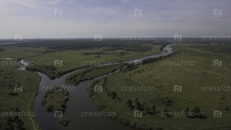 Вид на прекрасную реку разворачивается на фоне зеленых полей. резервные кадры. летняя панорама зелёных полей и устьев рек. красивые реки на зеленых полях летом