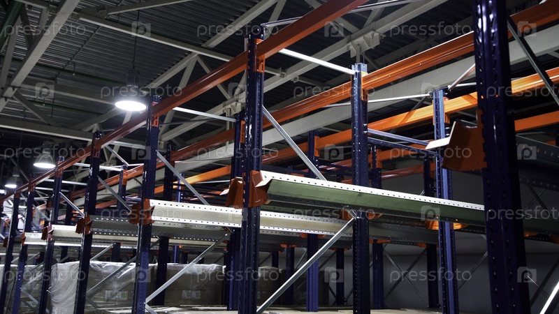 Хранилище, большая логистическая структура торговли.Креативное.Большие металлические полки в современном складе, промышленный склад на производственном заводе