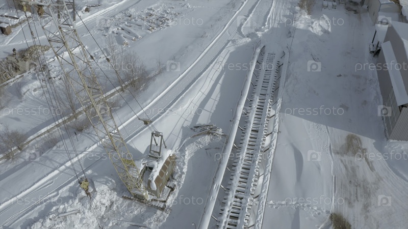 Вид на промышленные здания зимой. Клип. Зимой, небольшие бизнес-здания за пределами города. Предприятия и малые фабрики в солнечный зимний день