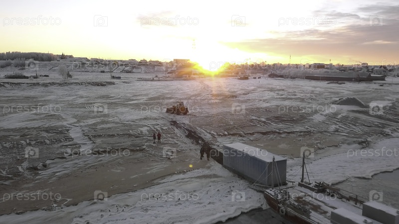 Разгрузка судна на побережье зимой. Клип. Верхний тип грузовых контейнеров разгружается на берегу с морским судном. Морской груз на побережье зимой