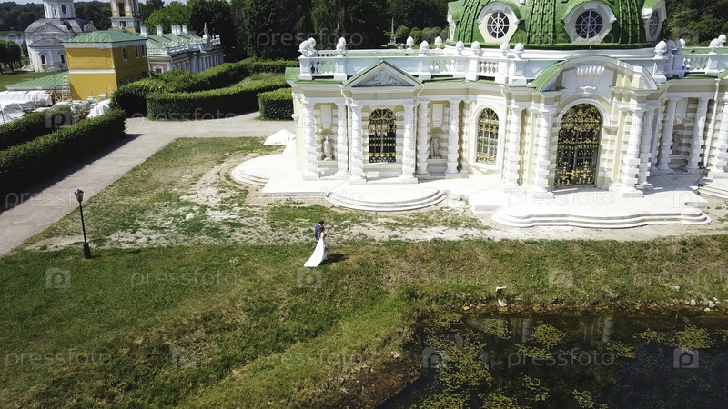Красивые молодожены гуляют во дворцовом парке.Креативно.Вид на новобрачных в Королевском парке летом.Новорожденные в парке старого дворца в солнечный летний день
