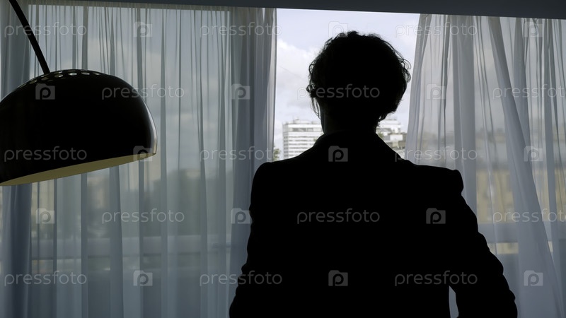 Молодой бизнесмен в гостиничном номере, молодой привлекательный мужчина в черном костюме стоит внутри и выглядит задумчивым