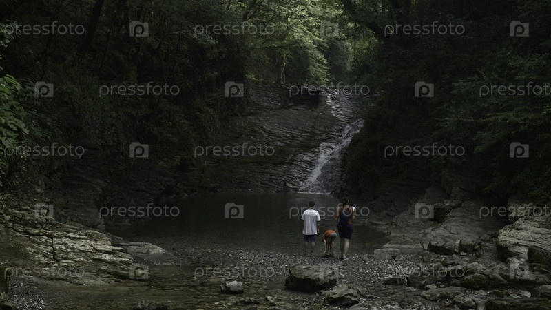 Семья смотрит на водопад в джунглях.Креативно.Семья туристов смотрят на красивый водопад в джунглях.Семья пришла к водопаду во время похода по джунглям