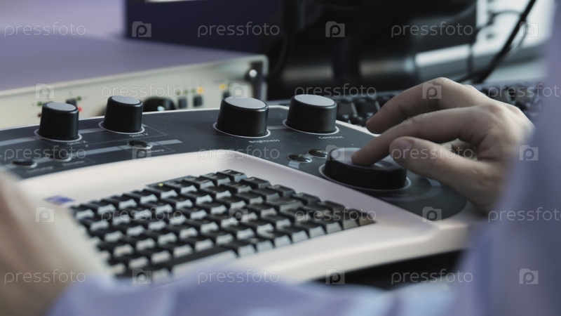 Клавиатура с врачебной мышью. Резервные кадры. Современная медицинская клавиатура с мышкой для ультразвуковой фиксации. Просмотр круглой мыши на медицинском осмотре