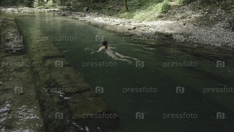 Женщина плывет в пруду в зеленом лесу.Креативно.Прекрасная женщина плавает в лесном озере.Женщина красиво плавает в озере в диком зелёном лесу