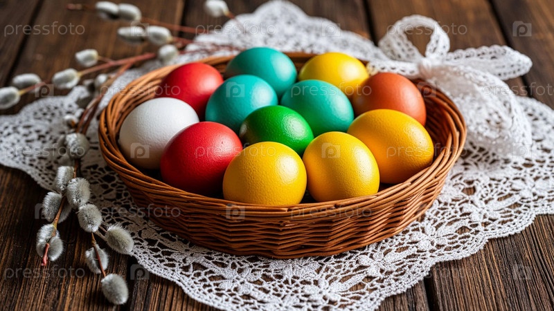 Корзина красочных яиц на Пасху