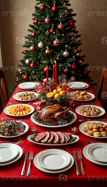 Праздничный стол на Новый год и Рождество с рождественской елкой и свечами