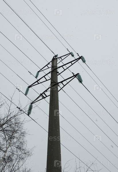 Бетонная поддержка линий электропередач среди деревьев при снегопаде