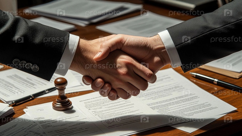 Деловое рукопожатие на фоне подписанных документов