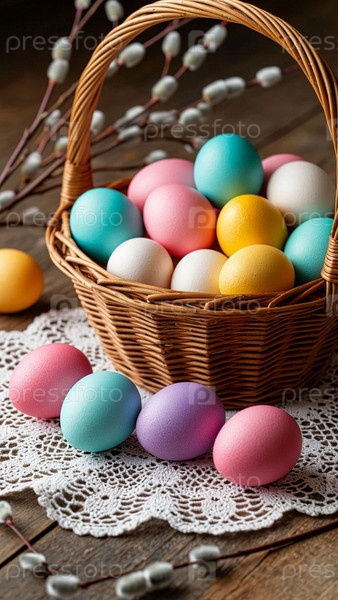 Корзина с яйцами на Пасху и ветви верби на столе