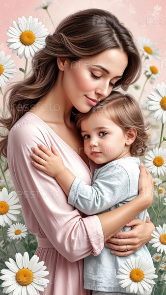 Мама нежно обнимает своего ребенка на фоне ромашек