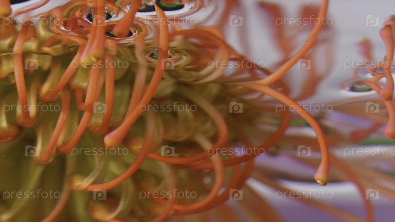 Удивительные оранжевые и желтые цветочные почки лейкоспермы внутри чистой воды. резервная запись. цветение летнего цветочного фона