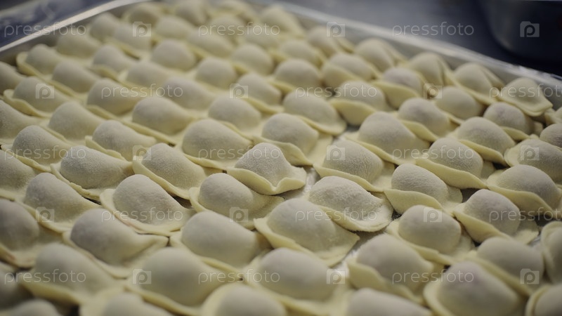 Производство русских пельменей на заводе. Клип. Готовые мясные пельмени или лежащие в рядах