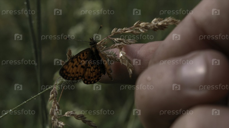 Закройте бабочку, медленно размахивая крыльями на стебле травы.Креативно.Рука и палец человека стараются нежно прикоснуться к насекомому