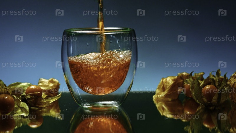 Закройте налив яблочного сока в стакан, стоя на стеклянной поверхности стола