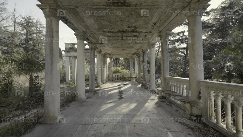Старое заброшенное здание с белыми колоннами. Продолжайте. Прекрасная перспектива со столбами заброшенного здания. Заброшенный коридор с колоннами в летнем лесу