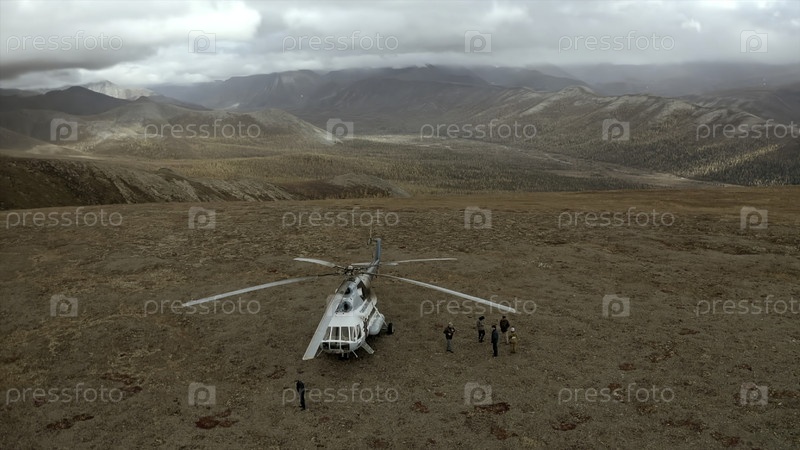 Концепция туризма.Клип.Вертолет приземляется возле группы людей в диком регионе с долиной и горами