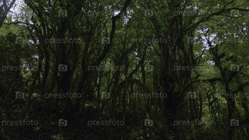 Густозеленый лес с моховыми деревьями. творческий. красивая зеленая корона деревьев со стволами моха. летний зелёный лес с мохом