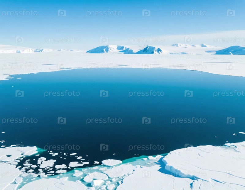 Замороженный лед покрывает землю пятнами голубой воды, видимой издалека.Горы возвышаются над чистым небом и создают холодную зимнюю сцену