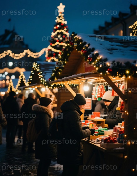 На рождественском рынке посетители просматривают киоски, наполненные праздничными предметами