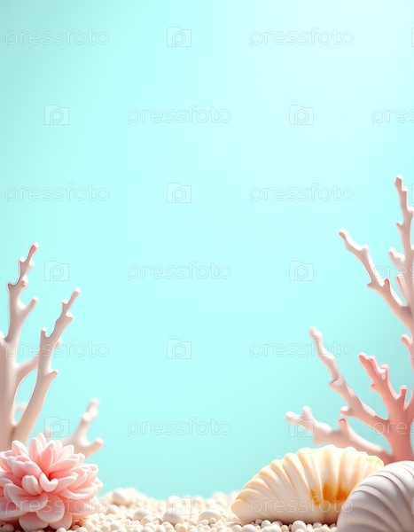Яркая подводная сцена показывает сложные кораллы и ракушки, отдыхающие на песчаном дне океана, освещенные мягким водным фоном, создавая спокойную и мечтательную атмосферу Generative AI