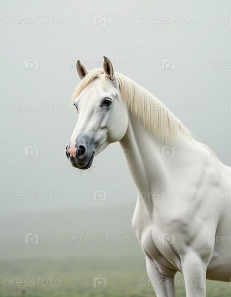 Потрясающий белый конь изящно стоит среди толстого тумана, демонстрируя свою грацию и красоту.Раннее утреннее освещение добавляет волшебный оттенок к этой спокойной обстановке