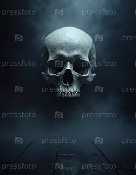 Череп парит в темном, туманном пространстве над глянцевым черным полом.Вокруг вращается таинственный туман, создающий тревожное и атмосферное ощущение