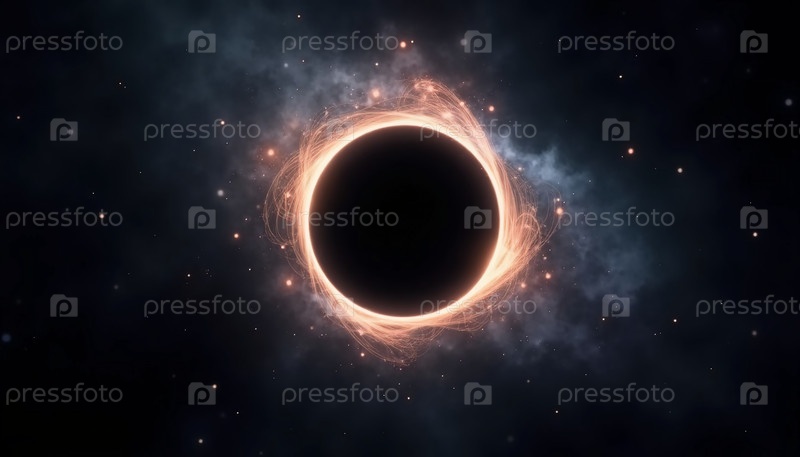 Черная дыра очаровывает своим огромным гравитационным притяжением, окруженной яркими потоками космической пыли и сияющими звездами, освещающими темные просторы генеративного пространства ИИ