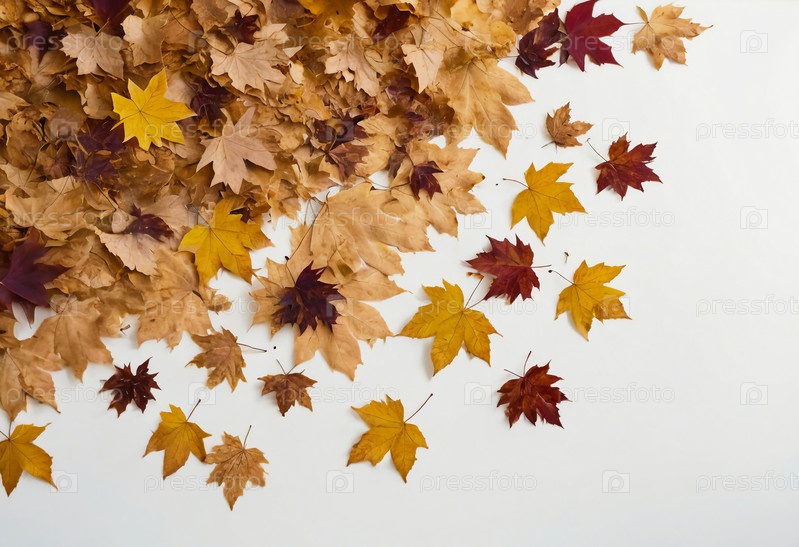 Очаровательное расположение различных осенних листьев разбросано по ярко белой поверхности, показывая оттенки желтого, оранжевого и темно-красного
