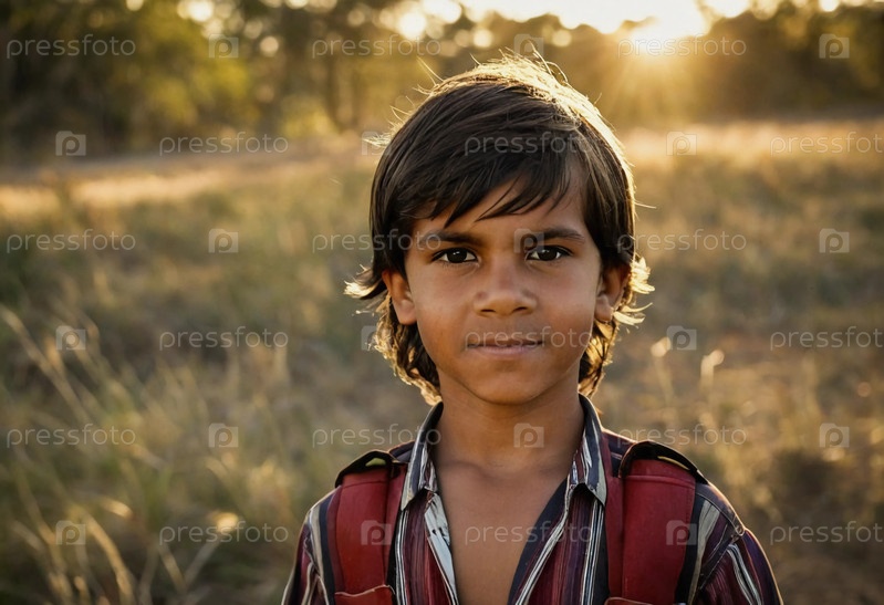 Молодой мальчик австралийского происхождения уверенно стоит среди сияющего заката.Его выражение лица отражает глубокую связь с культурой и миром природы