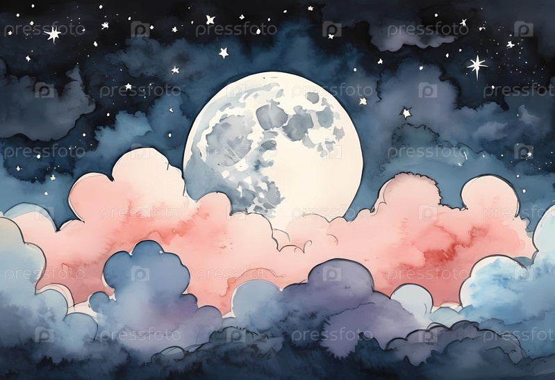 Странное акварельное ночное небо с сияющей луной и нежными облаками, приглашающее к творчеству и созерцанию