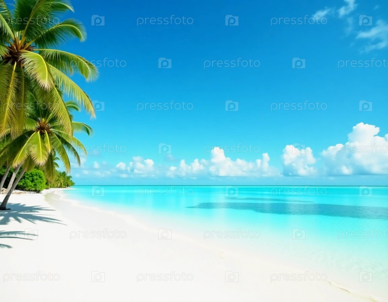 Нежные волны бьют мягкий белый песок, когда пышные пальмы склоняются к чистой бирюзовой воде.Магические облака плавают над ярко-синим небом, создавая идеальный тропический рай