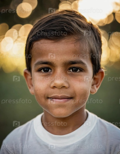 Молодой мальчик австралийских аборигенов, его яркая улыбка освещена теплым светом солнечного света