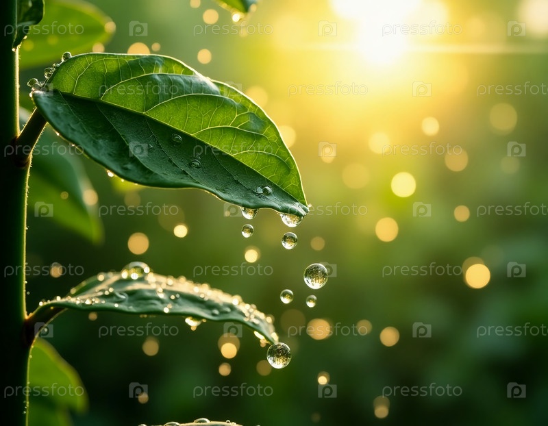 Капли воды цепляются за пышные зеленые листья, сверкающие в утреннем свете.Мягкое золотистое сияние омывает окрестности, улучшая спокойную атмосферу красоты природы