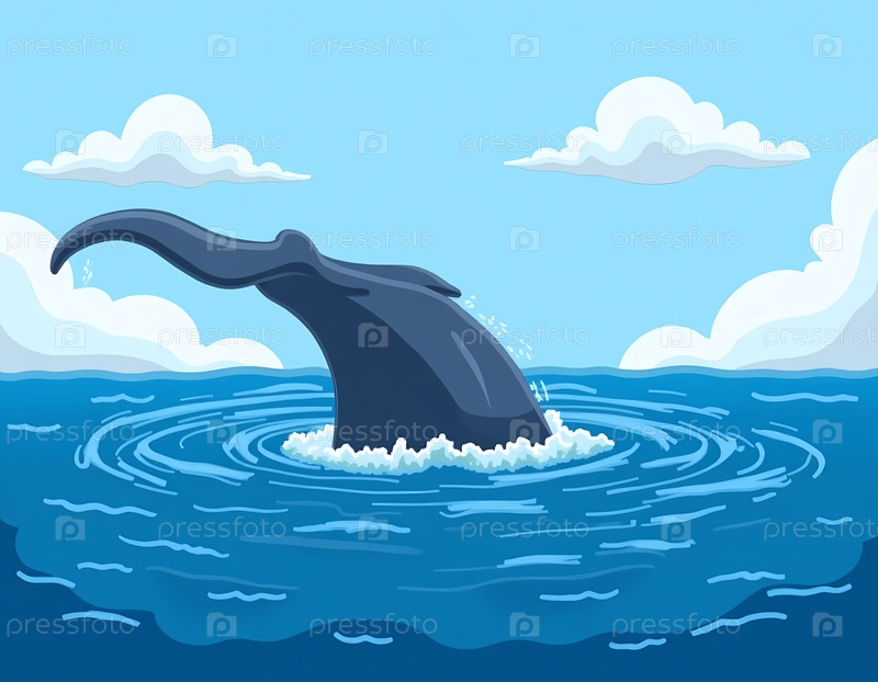 Великолепный морской млекопитающий выходит из воды, показывая свой особый силуэт.Нежные волны пульсируют вокруг его тела, когда облака лениво дрейфуют над ясным небом